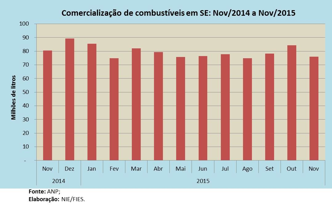 Análise realizada pelo Boletim Sergipe Econômico, parceria do Núcleo de Informações Econômicas (NIE) da Federação das Indústrias do Estado de Sergipe (FIES) e do Departamento de Economia da UFS, com base nos dados da ANP, indicou que as vendas de combustíveis no estado atingiram pouco mais de 76 milhões de litros em novembro de 2015, registrando queda de 5,6% em relação ao mesmo mês de 2014. No comparativo com o mês imediatamente anterior, outubro último, também notou-se queda, porém, de 9,9% nas vendas.