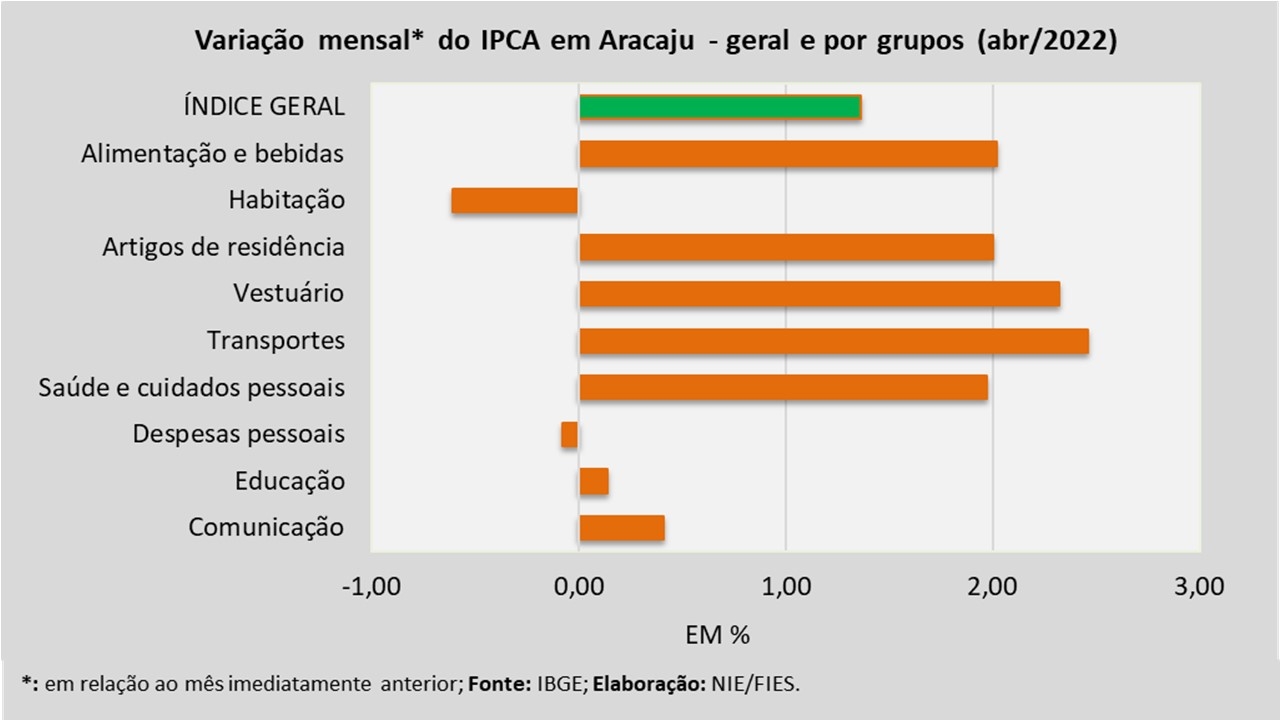 Análise realizada pelo Núcleo de Informações Econômicas da Federação das Indústrias do Estado de Sergipe (FIES), com base nos dados do Instituto Brasileiro de Geografia e Estatística (IBGE), revelou que, em abril deste ano, a capital sergipana teve inflação de 1,36%, medida pelo Índice de Preços ao Consumidor Amplo – IPCA.