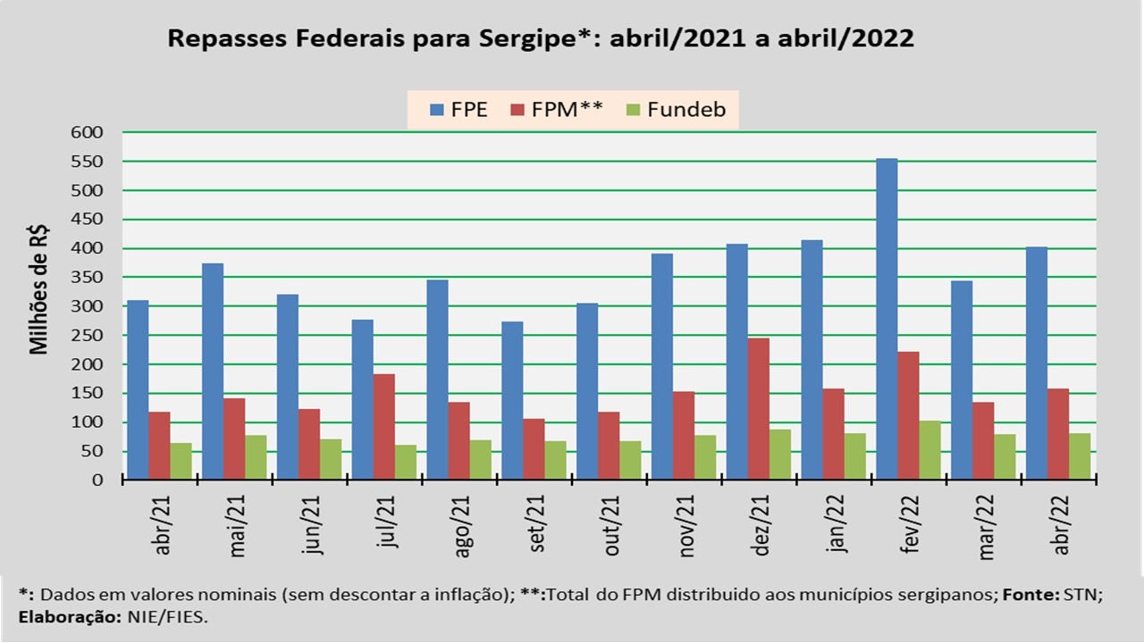 Análise realizada pelo Núcleo de Informações Econômicas da Federação das Indústrias do Estado de Sergipe (FIES), com base nos dados da Secretaria do Tesouro Nacional (STN), indicou que o repasse do Fundo de Participação dos Estados (FPE) para Sergipe, em abril do ano corrente, foi de aproximadamente R$ 402,5 milhões.