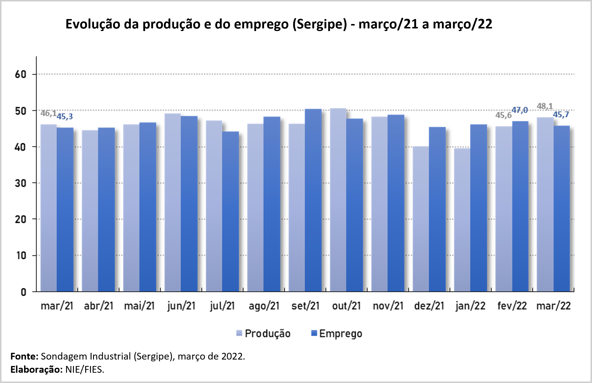 A Sondagem Industrial de Sergipe elaborada pelo Núcleo de Informações Econômicas (NIE), da Federação das Indústrias do Estado de Sergipe (FIES), revelou que a Utilização da Capacidade Instalada (UCI) das empresas diminuiu 1,0 ponto percentual, em março de 2022 em relação ao mesmo mês de 2021, alcançando 63%. No comparativo com fevereiro de 2022, o índice de março recuou 5,0 pontos percentuais. Os indicadores de volume de produção e de evolução do emprego traduziram redução, dado que ficaram abaixo de 50 pontos, com 48,1 pontos e 45,7 pontos, respectivamente.