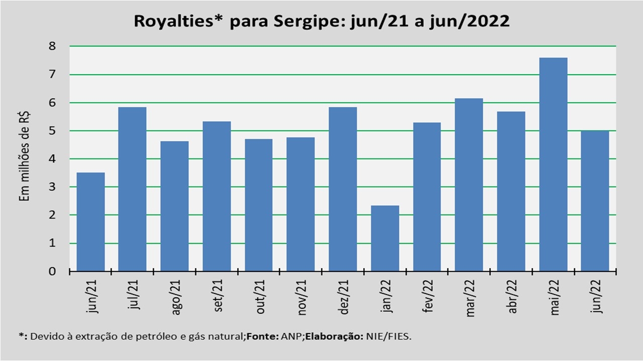 Análise realizada pelo Núcleo de Informações Econômicas da Federação das Indústrias do Estado de Sergipe (FIES), com base nos dados da Agência Nacional do Petróleo, Gás Natural e Biocombustíveis (ANP), revelou que o pagamento de royalties ao Estado de Sergipe, referentes à extração de petróleo e gás natural do mês de abril último, somou R$ 5 milhões. O valor, segundo a ANP, foi creditado em junho.