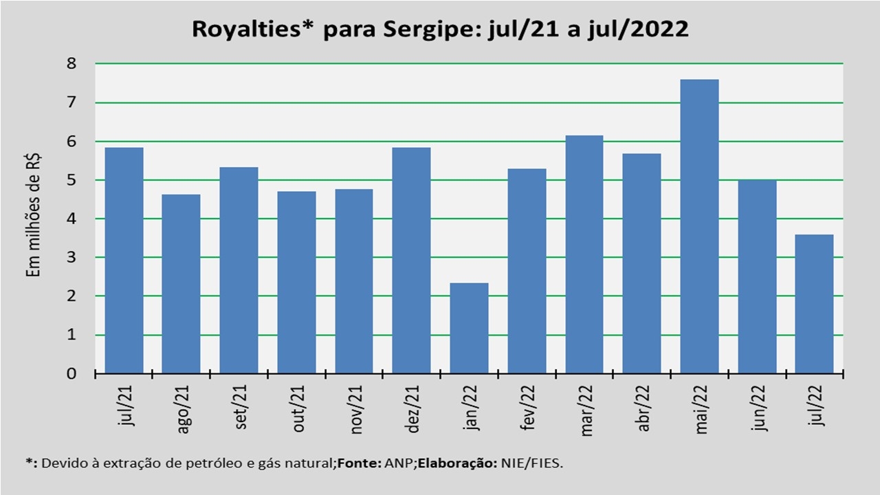 Análise realizada pelo Núcleo de Informações Econômicas da Federação das Indústrias do Estado de Sergipe (FIES), com base nos dados da Agência Nacional do Petróleo, Gás Natural e Biocombustíveis (ANP), revelou que o pagamento de royalties ao Estado de Sergipe, referentes à extração de petróleo e gás natural do mês de maio último, somou aproximadamente R$ 3,6 milhões. O valor, segundo a ANP, foi creditado em julho.