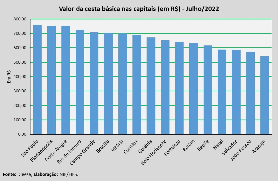 Em termos absolutos, a capital com a cesta mais cara, no mês analisado, foi São Paulo (R$ 760,45), seguida por Florianópolis (R$ 753,73) e Porto Alegre (R$ 752,84). Já as capitais com as cestas mais baratas foram Aracaju (R$ 542,50), seguida por João Pessoa (R$ 572,63) e Salvador (R$ 586,54).