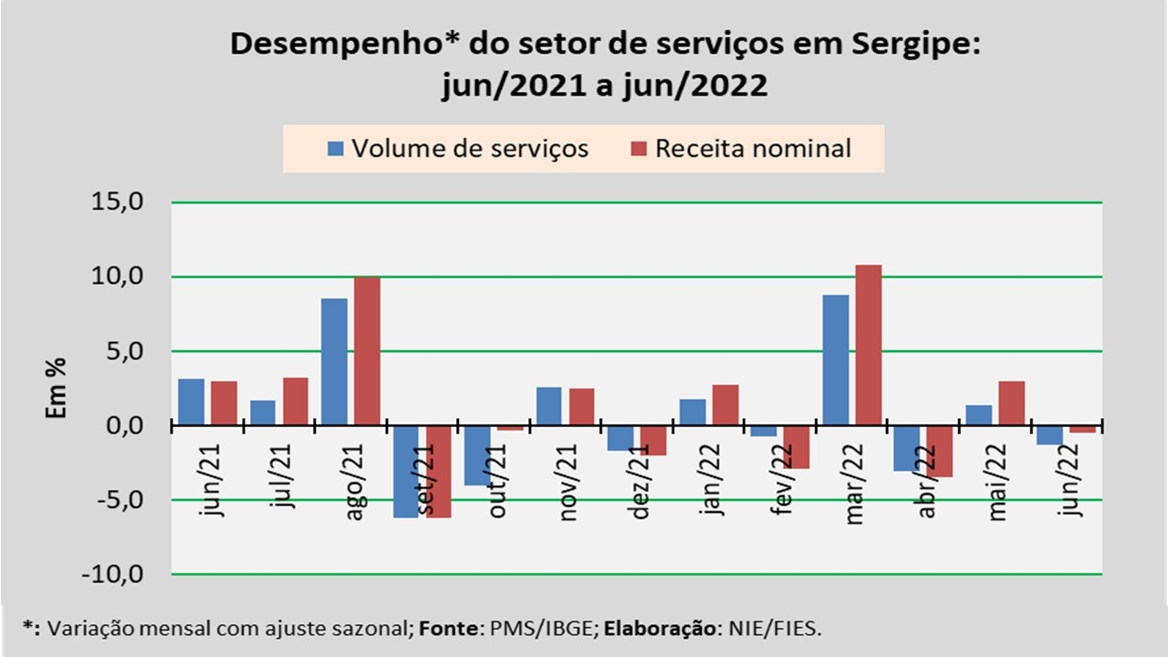 Análise realizada pelo Núcleo de Informações Econômicas da Federação das Indústrias do Estado de Sergipe (FIES), com base nos dados da Pesquisa Mensal de Serviços (PMS) do IBGE, revelou que, em junho, o setor de serviços em Sergipe apresentou retração de 1,3% no volume de serviços prestados, em relação ao último mês de maio, na série com ajuste sazonal (método utilizado para uniformizar os períodos de comparação). Na comparação com junho de 2021, o volume de serviços assinalou acréscimo de 6,7%.