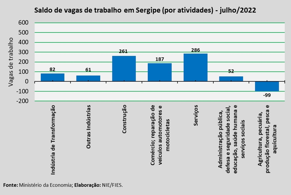 A análise dos dados apontou que, em julho, houve abertura de vagas em quase todos os sete grupamentos de atividades econômicas do estado, sendo a exceção o grupamento de Agricultura, pecuária, produção florestal, pesca e aquicultura, ao registrar fechamento de 99 postos de trabalho. Dentre os que apresentaram abertura de novos postos de trabalho, destacou-se o de Serviços, com abertura de 286 vagas. Em seguida ficaram os grupamentos de Construção (+261); de Comércio; reparação de veículos automotores e motocicletas (+187 vagas); Indústria de Transformação (+82 vagas); Outras Indústrias (+61 vagas) e Administração pública, defesa e seguridade social, saúde humana e serviços sociais (+52 vagas).