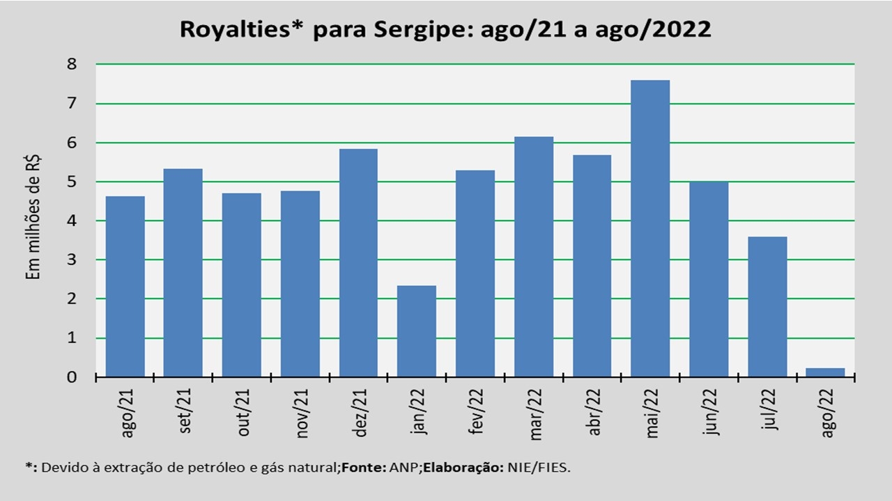 Em agosto do ano corrente, os royalties creditados aos municípios sergipanos totalizaram R$ 22,6 milhões. Dentre eles, o município que auferiu a maior fatia foi São Cristóvão, com R$ 4,3 milhões, ou 19,2% do total.