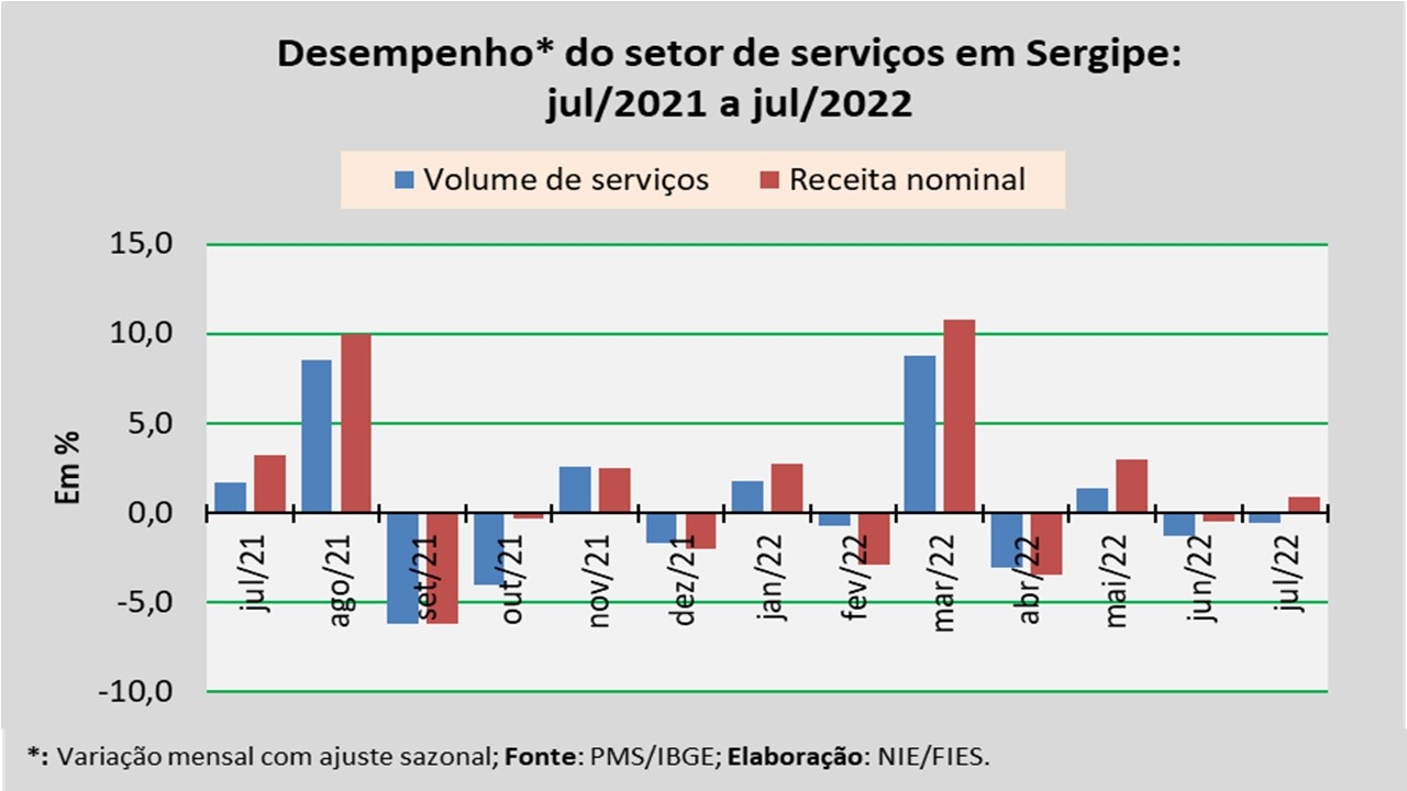 Análise realizada pelo Núcleo de Informações Econômicas da Federação das Indústrias do Estado de Sergipe (FIES), com base nos dados da Pesquisa Mensal de Serviços (PMS) do IBGE, revelou que, em julho, o setor de serviços em Sergipe apresentou retração de 0,6% no volume de serviços prestados, em relação ao último mês de junho, na série com ajuste sazonal (método utilizado para uniformizar os períodos de comparação). Na comparação com julho de 2021, o volume de serviços assinalou acréscimo de 4,6%.