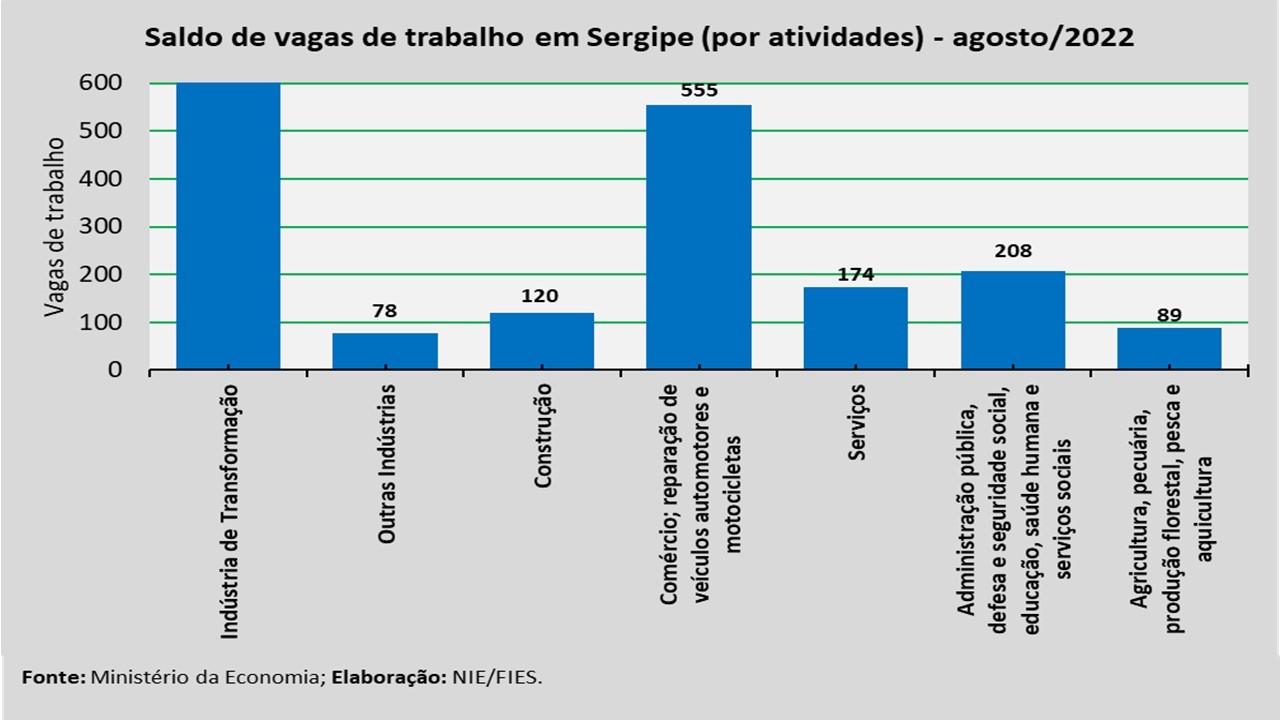A análise dos dados apontou que, em agosto, houve abertura de vagas em todos os sete grupamentos de atividades econômicas do estado, com destaque para a Indústria de Transformação que registrou abertura de 555 postos de trabalho. Em seguida ficaram os grupamentos do Comércio; reparação de veículos automotores e motocicletas (+555 vagas); Administração pública, defesa e seguridade social, saúde humana e serviços sociais (+208 vagas); Serviços (+174 vagas); Construção (+120 vagas); Agricultura, pecuária, produção florestal, pesca e aquicultura (+89 vagas) e Outras Indústrias (+78 vagas).