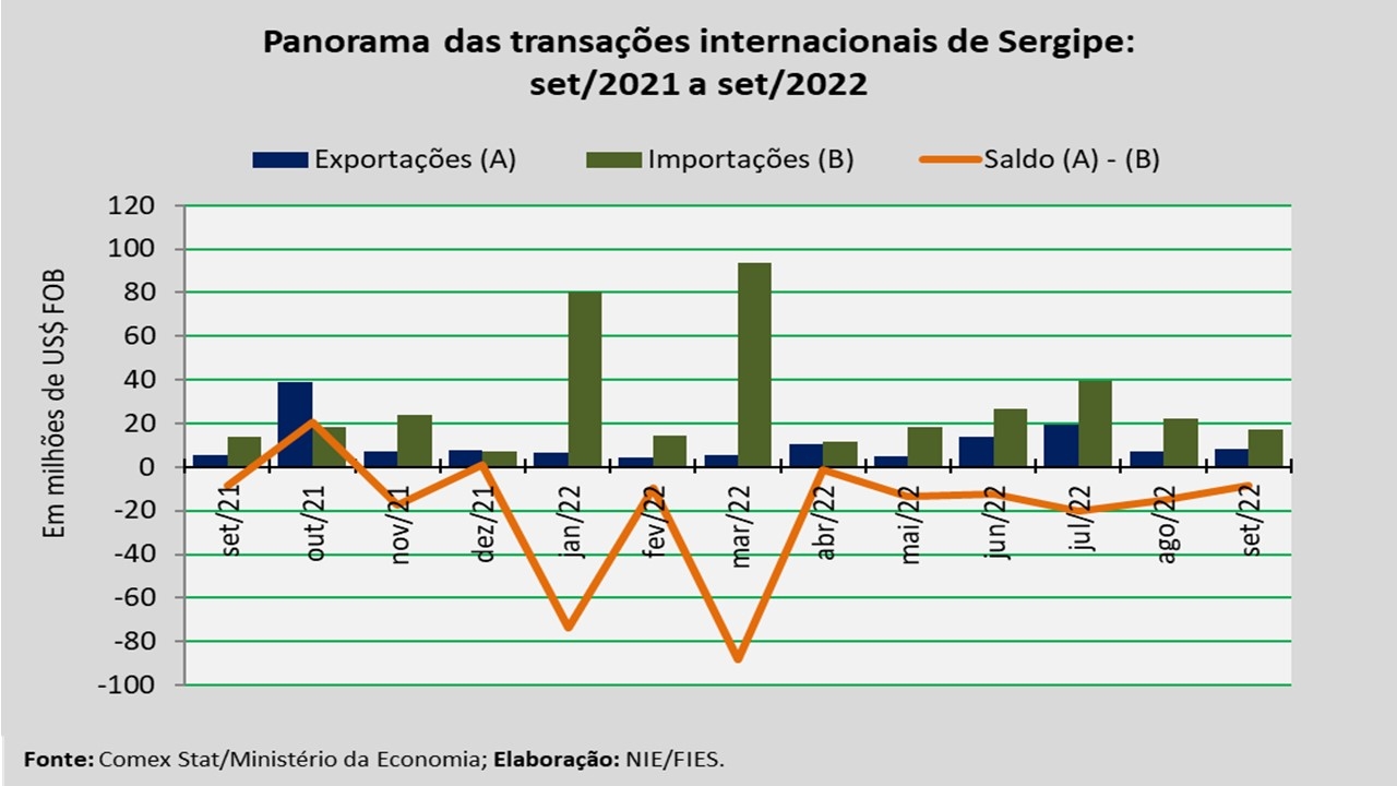 Análise realizada pelo Centro Internacional de Negócios – CIN/SE, da Federação das Indústrias do Estado de Sergipe (FIES), com base nos dados do Comex Stat, sistema para consultas e extração de dados do comércio exterior brasileiro, disponibilizado pelo Ministério da Economia, apontou que as exportações sergipanas, em setembro deste ano, somaram US$ 8,5 milhões. O montante registrado representa um aumento de 18,8%, quando comparado com o mês anterior, agosto último. Já em relação a setembro de 2021, verificou-se crescimento de 49,9%.