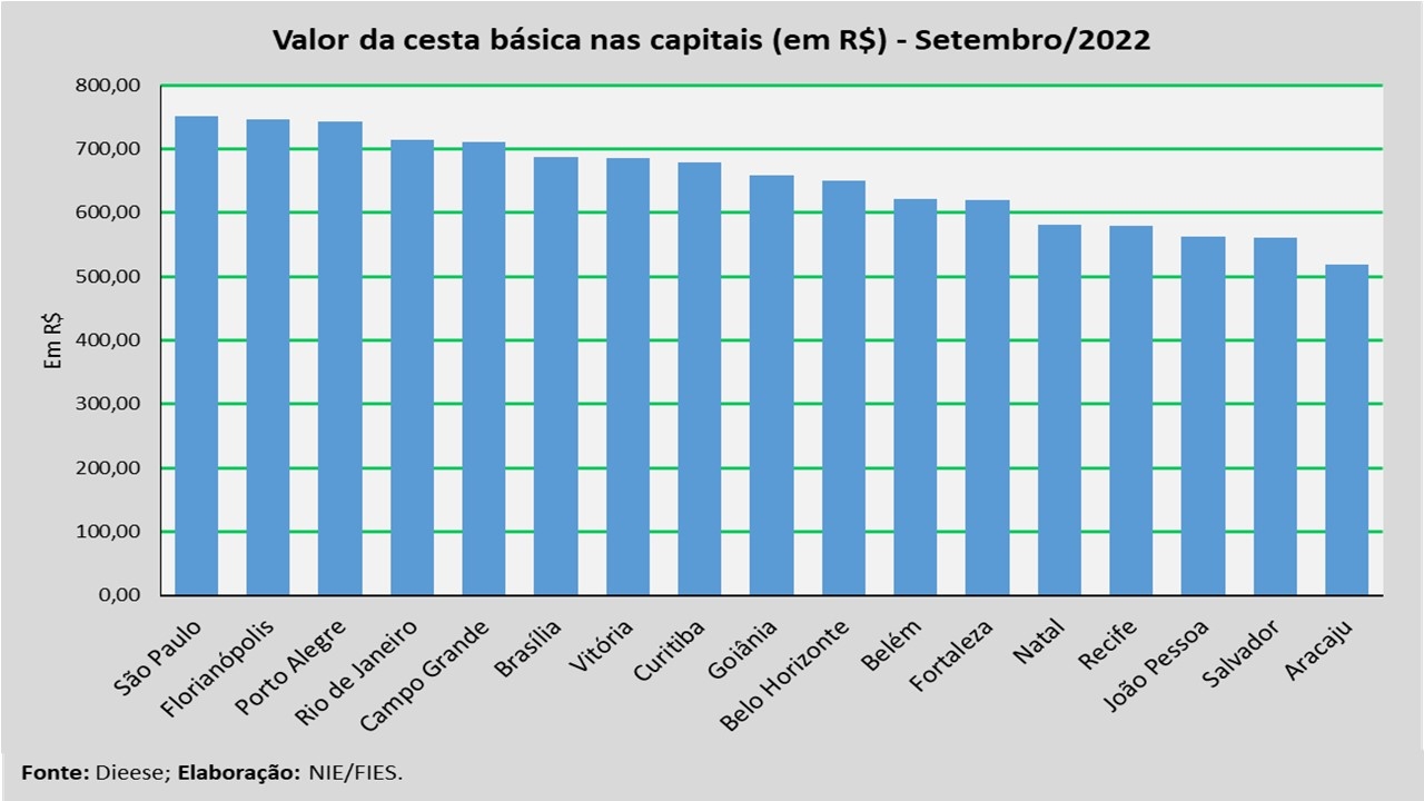 Em termos absolutos, a capital com a cesta mais cara, no mês analisado, foi São Paulo (R$ 750,74), seguida por Florianópolis (R$ 746,55) e Porto Alegre (R$ 743,94). Já as capitais com as cestas mais baratas foram Aracaju (R$ 518,68), seguida por Salvador (R$ 560,31) e João Pessoa (R$ 562,32).