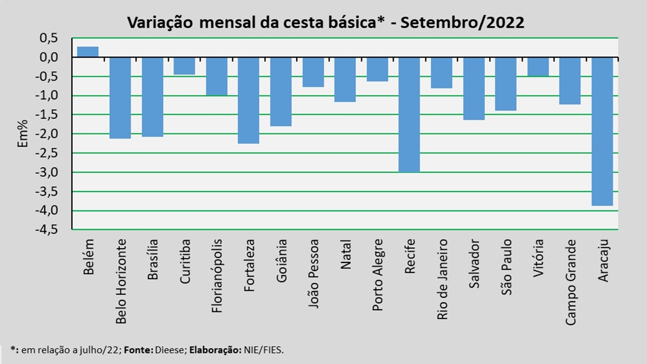 No mês analisado, levando-se em consideração a comparação com o mês anterior (agosto/2022), observou-se redução no valor da cesta em 12 das 17 capitais pesquisadas. Destacaram-se com as reduções mais expressivas Aracaju (-3,87%), Recife (-3,03%) e Salvador (-2,88%).