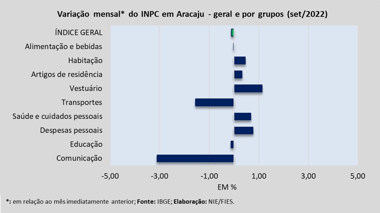 Em Aracaju, no período analisado, dos nove grupos de produtos e serviços pesquisados para medir o comportamento dos preços, quatro apresentaram variação negativa de preço, com destaque para o grupo de Comunicação, que registrou deflação de 2,58%. Em seguida, ficaram os grupos de Transporte (-1,43%), Alimentação e bebidas (-0,23%) e Educação (-0,01%).