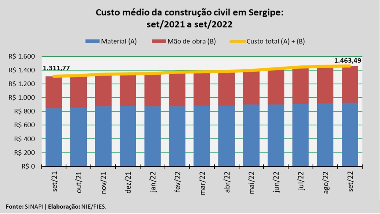 Em termos relativos, o custo com material, no mês considerado, teve aumento de 9,4% na comparação com o mesmo mês do ano que findou (setembro/2021). No entanto, quando comparado com agosto de 2022, o acréscimo verificado foi de 1,0%.