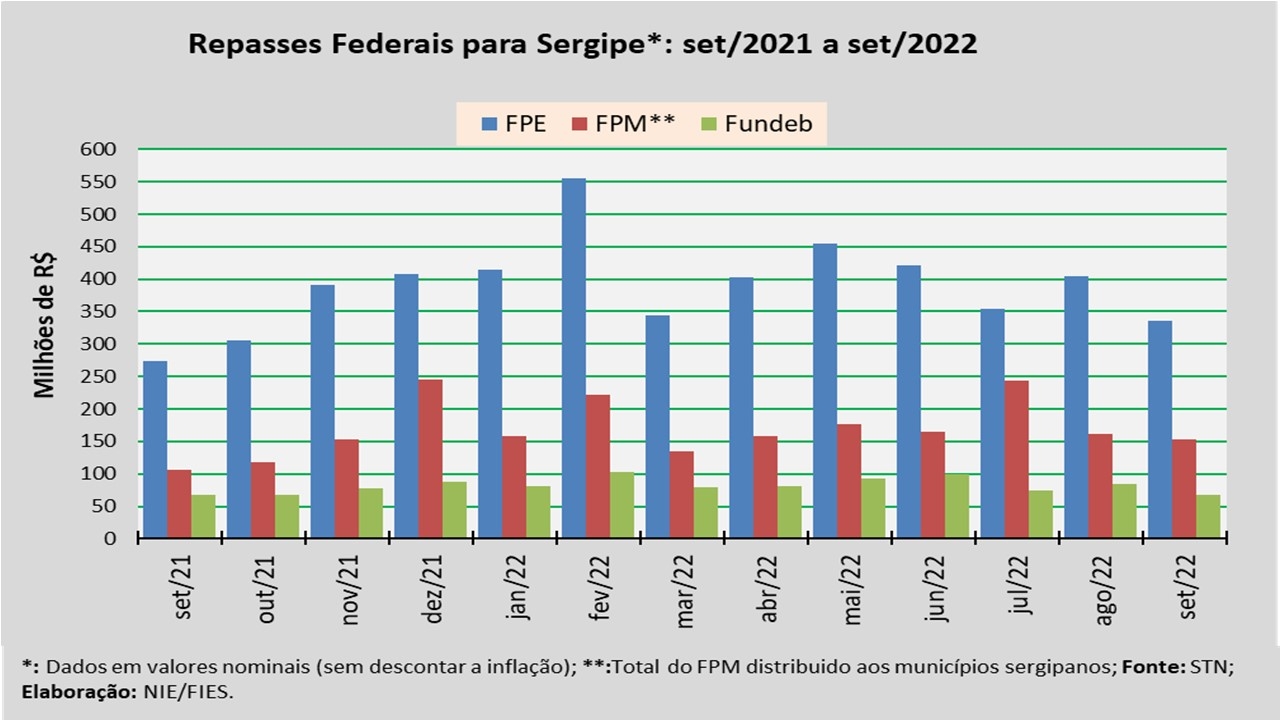 Análise realizada pelo Núcleo de Informações Econômicas da Federação das Indústrias do Estado de Sergipe (FIES), com base nos dados da Secretaria do Tesouro Nacional (STN), indicou que o repasse do Fundo de Participação dos Estados (FPE) para Sergipe, em setembro do ano corrente, foi de aproximadamente R$ 336,0 milhões.