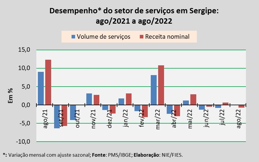 Análise realizada pelo Núcleo de Informações Econômicas da Federação das Indústrias do Estado de Sergipe (FIES), com base nos dados da Pesquisa Mensal de Serviços (PMS) do IBGE, revelou que, em agosto, o setor de serviços em Sergipe apresentou retração de 0,1% no volume de serviços prestados, em relação ao último mês de julho, na série com ajuste sazonal (método utilizado para uniformizar os períodos de comparação). Na comparação com agosto de 2021, o volume de serviços assinalou decréscimo de 4,3%.