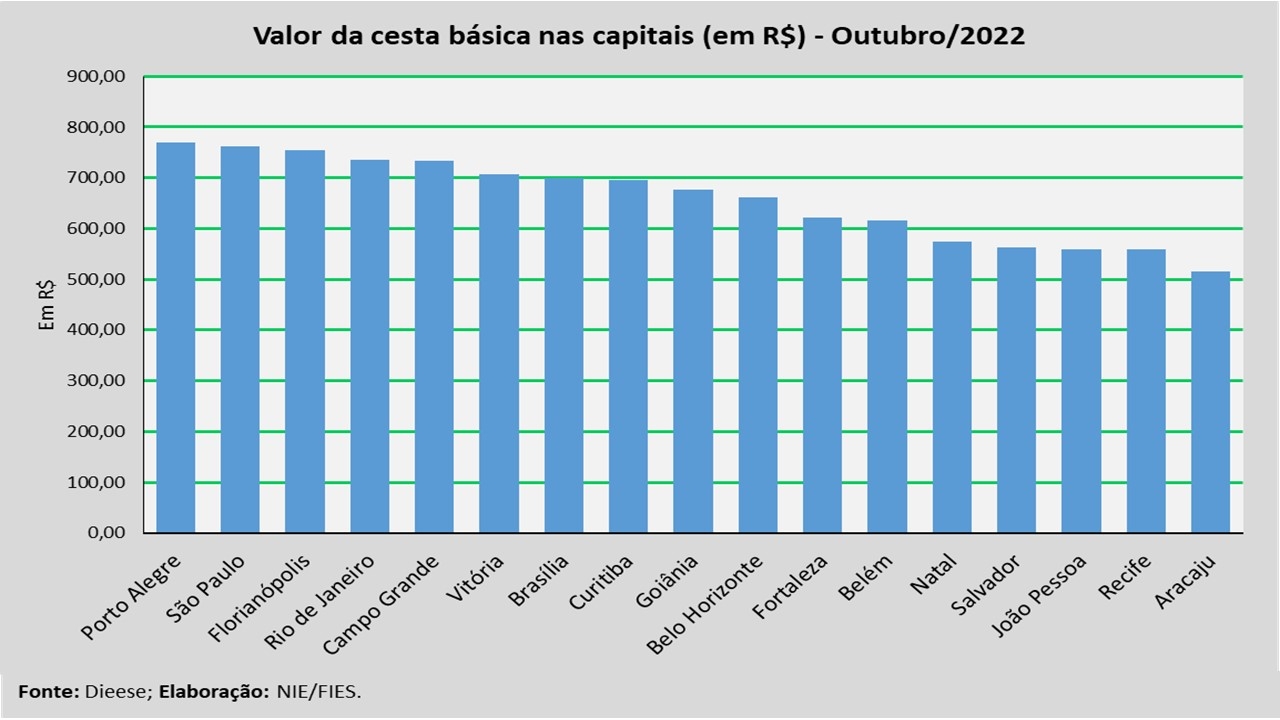 Em termos absolutos, a capital com a cesta mais cara, no mês analisado, foi Porto Alegre (R$ 768,82), seguida por São Paulo (R$ 762,20) e Florianópolis (R$ 753,82). Já as capitais com as cestas mais baratas foram Aracaju (R$ 515,51), seguida por Recife (R$ 558,40) e João Pessoa (R$ 559,57).