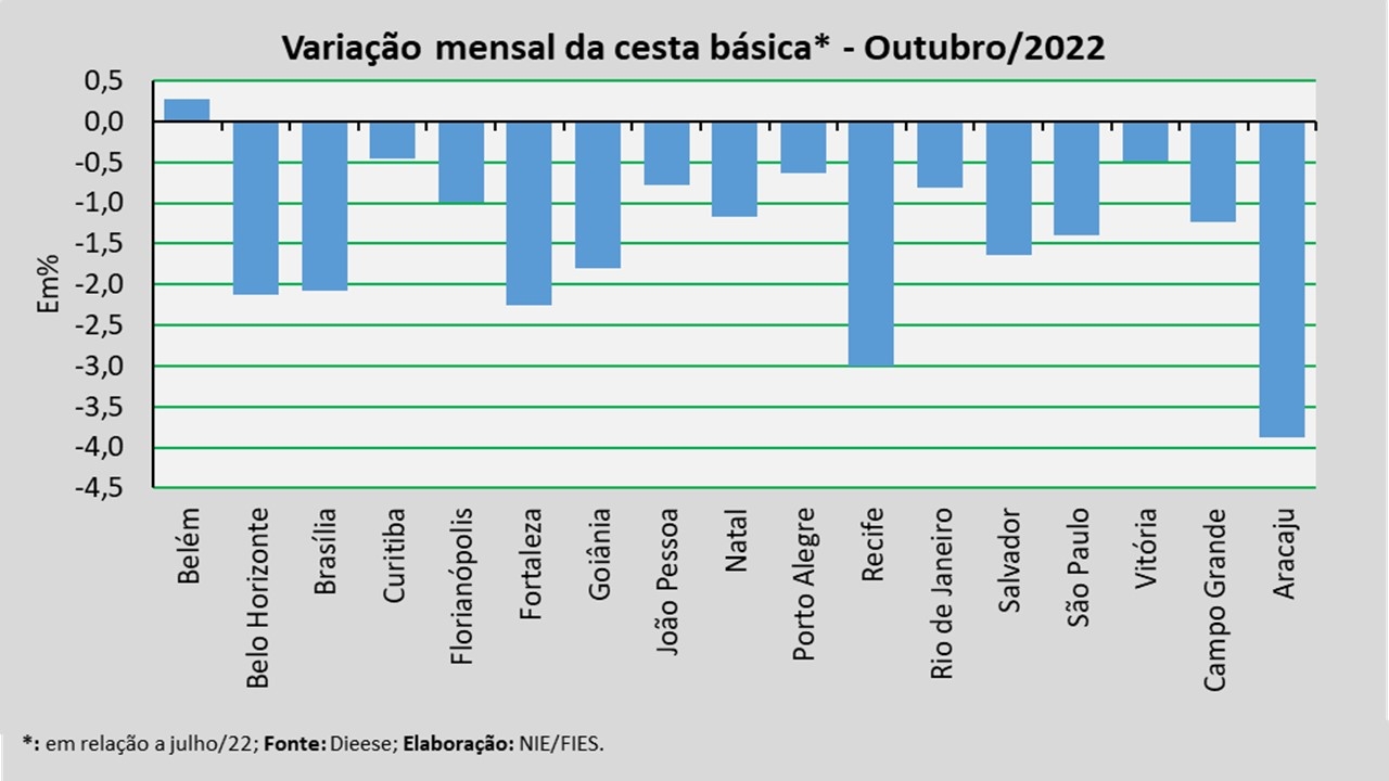 No mês analisado, levando-se em consideração a comparação com o mês anterior (setembro/2022), observou-se redução no valor da cesta em 5 das 17 capitais pesquisadas. Destacaram-se com as reduções mais expressivas Recife (-3,73%), Natal (-1,40%) e Belém (-1,16%).