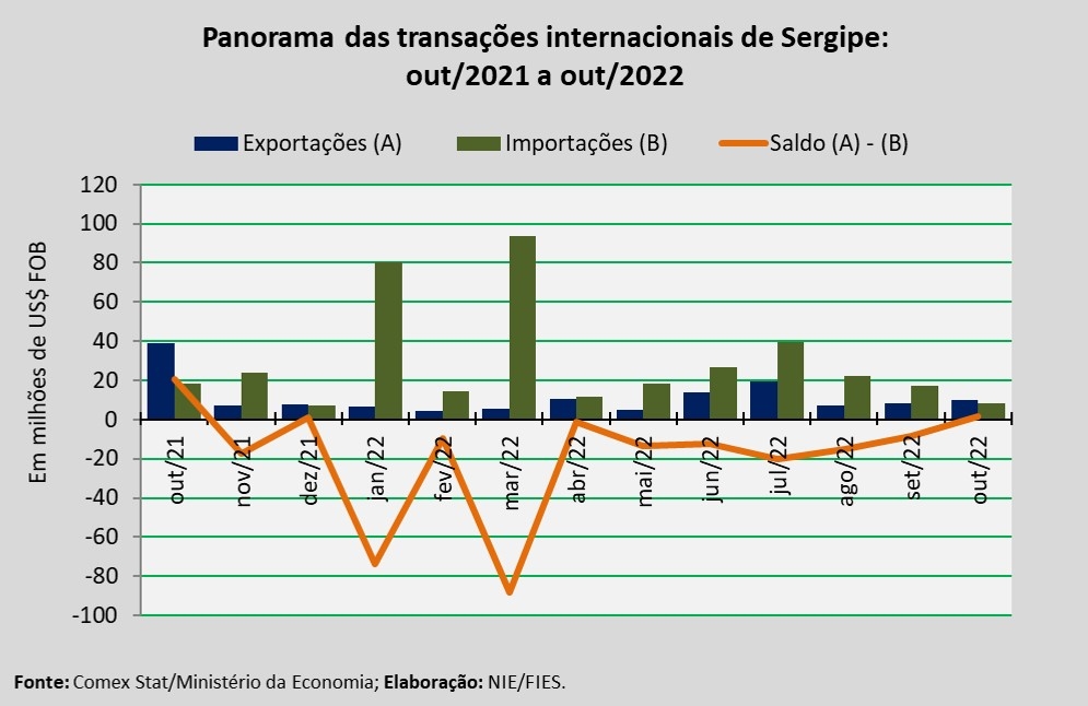 Análise realizada pelo Centro Internacional de Negócios – CIN/SE, da Federação das Indústrias do Estado de Sergipe (FIES), com base nos dados do Comex Stat, sistema para consultas e extração de dados do comércio exterior brasileiro, disponibilizado pelo Ministério da Economia, apontou que as exportações sergipanas, em outubro deste ano, somaram US$ 10,2 milhões. O montante registrado representa um aumento de 20,0%, quando comparado com o mês anterior, setembro último. Já em relação a outubro de 2021, verificou-se redução de 73,9%.