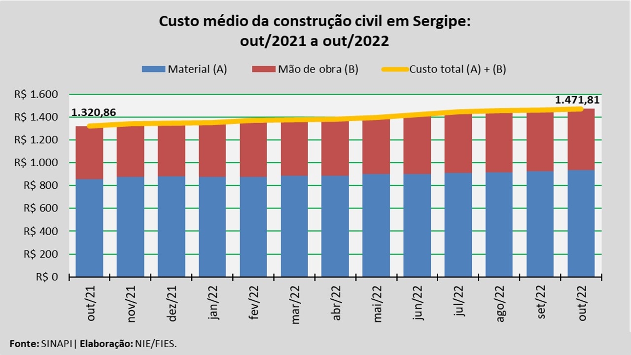 Análise realizada pelo Núcleo de Informações Econômicas da Federação das Indústrias do Estado de Sergipe (FIES), com base nos dados do Sistema Nacional de Pesquisa de Custos e Índices da Construção Civil – SINAPI, uma produção conjunta do IBGE e da Caixa Econômica Federal, revelou que o custo médio da construção em Sergipe, por metro quadrado (m²), em outubro deste ano, registrou aumento de 0,6%, quando comparado com o mês imediatamente anterior, setembro último. Na comparação com o mês de outubro do ano passado, o custo registrado apresentou crescimento de 11,4%.