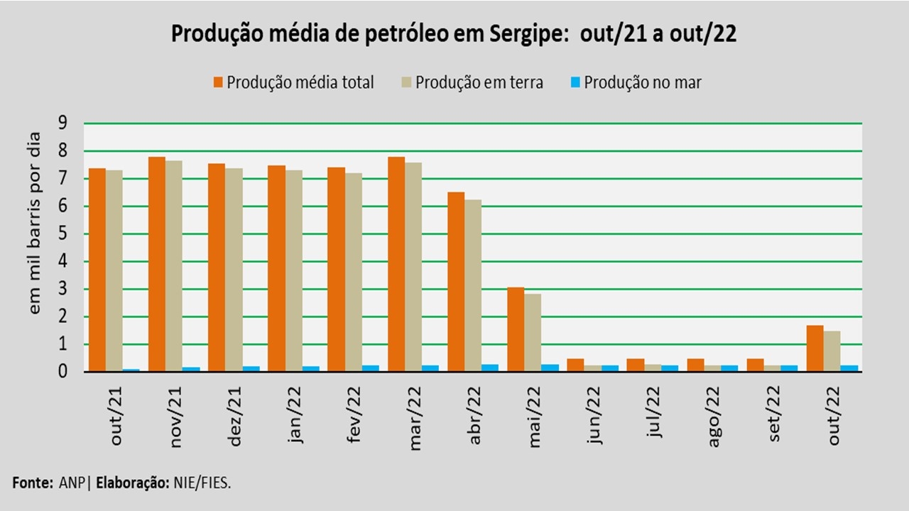 Análise realizada pelo Núcleo de Informações Econômicas da Federação das Indústrias do Estado de Sergipe (FIES), com base nos dados da Agência Nacional do Petróleo, Gás Natural e Biocombustíveis (ANP), revelou que a produção de petróleo no estado, no mês de outubro, alcançou, em média, 1,7 mil barris por dia (bpd), registrando um aumento de 255,0% em relação à produção média do mês anterior (setembro/2022). No comparativo com outubro de 2021, verificou-se decréscimo de 77,1%.