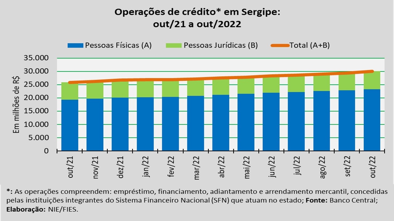 Análise realizada pelo Núcleo de Informações Econômicas da Federação das Indústrias do Estado de Sergipe (FIES), com base nos dados do Banco Central, revelou que o saldo total das operações de crédito em Sergipe, em outubro do ano corrente, somou R$ 30,0 bilhões, registrando o maior valor da série histórica iniciada em 2004.