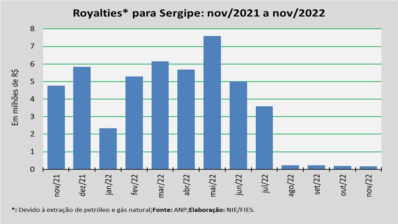 Em novembro do ano corrente, os royalties creditados aos municípios sergipanos totalizaram R$ 20,1 milhões. Dentre eles, o município que auferiu a maior fatia foi São Cristóvão, com cerca de R$ 3,9 milhões, ou 19,3% do total.