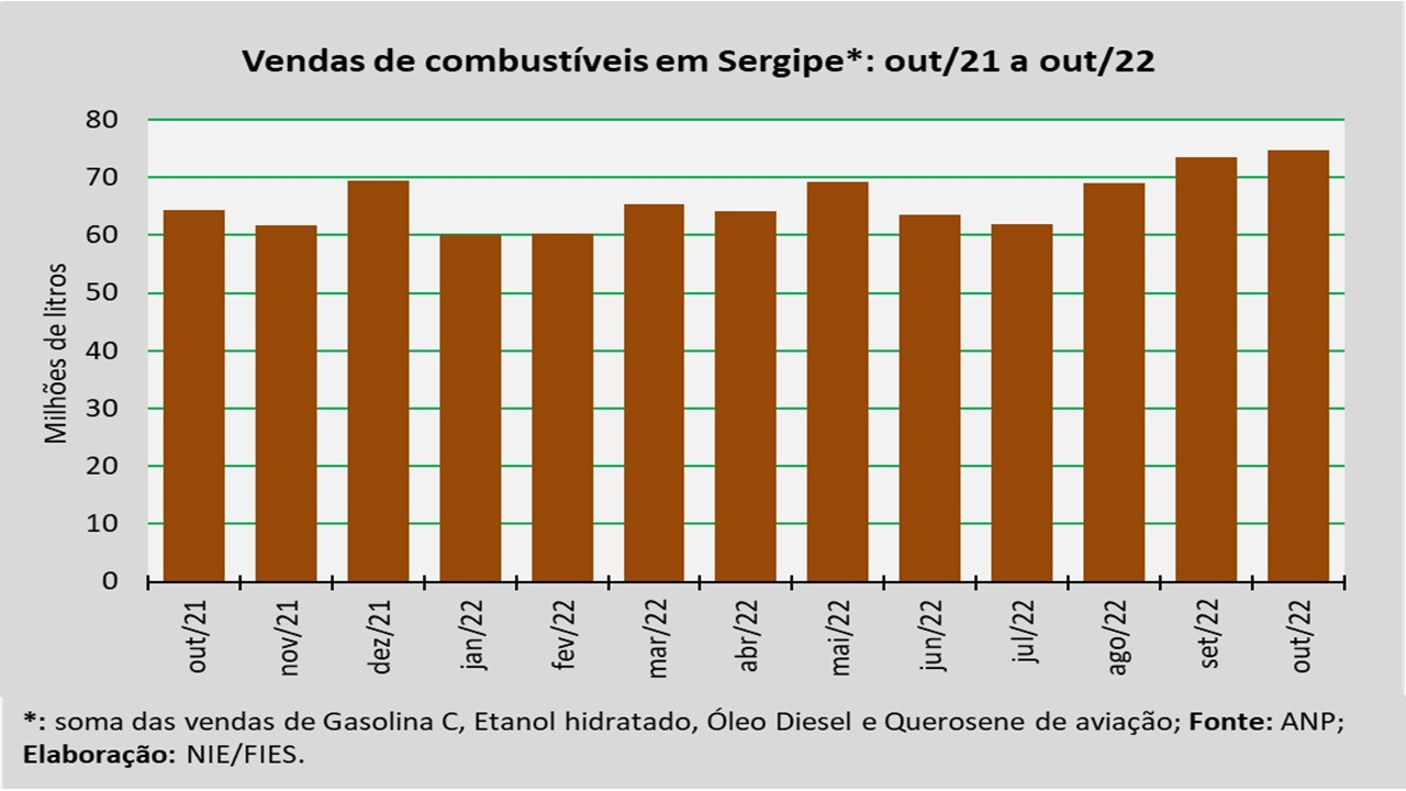 Análise realizada pelo Núcleo de Informações Econômicas da Federação das Indústrias do Estado de Sergipe (FIES), com base nos dados da Agência Nacional do Petróleo, Gás Natural e Biocombustíveis (ANP), indicou que as vendas totais de combustíveis em Sergipe, no mês de outubro, totalizaram 74,6 milhões de litros, assinalando crescimento de 15,8% quando comparado a outubro de 2021. Em relação ao mês imediatamente anterior (setembro/2022), as vendas aumentaram 1,5%.
