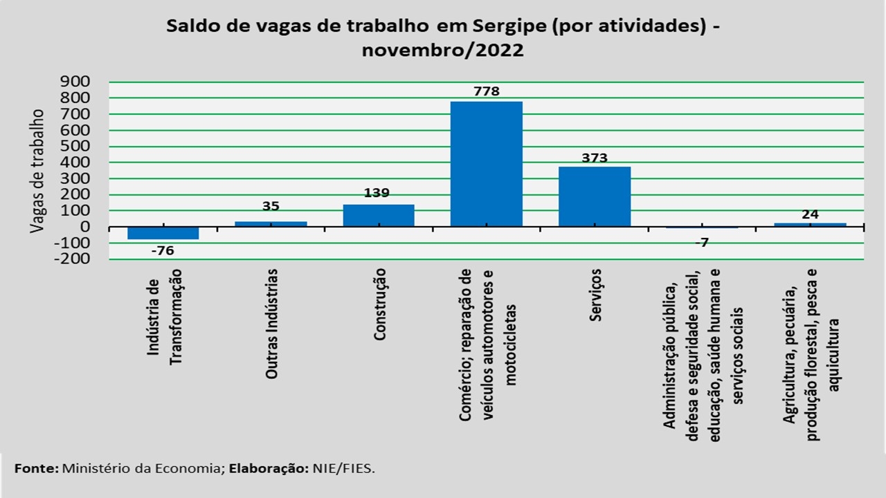 A análise dos dados apontou que, em novembro, houve abertura de vagas em cinco dos sete grupamentos de atividades econômicas do estado, com destaque para a Comércio; reparação de veículos automotores e motocicletas que registrou abertura de 778 postos de trabalho. Em seguida ficaram os grupamentos de Serviços (+373 vagas); Construção (+139 vagas); Outras Indústrias (+35 vagas); e de Agricultura, pecuária, produção florestal, pesca e aquicultura (+24 vagas). Por outro lado, registraram fechamentos de postos de trabalho os grupamentos de Indústria de Transformação (-76 vagas) e de Administração pública, defesa e seguridade social, saúde humana e serviços sociais (-7 vagas).
