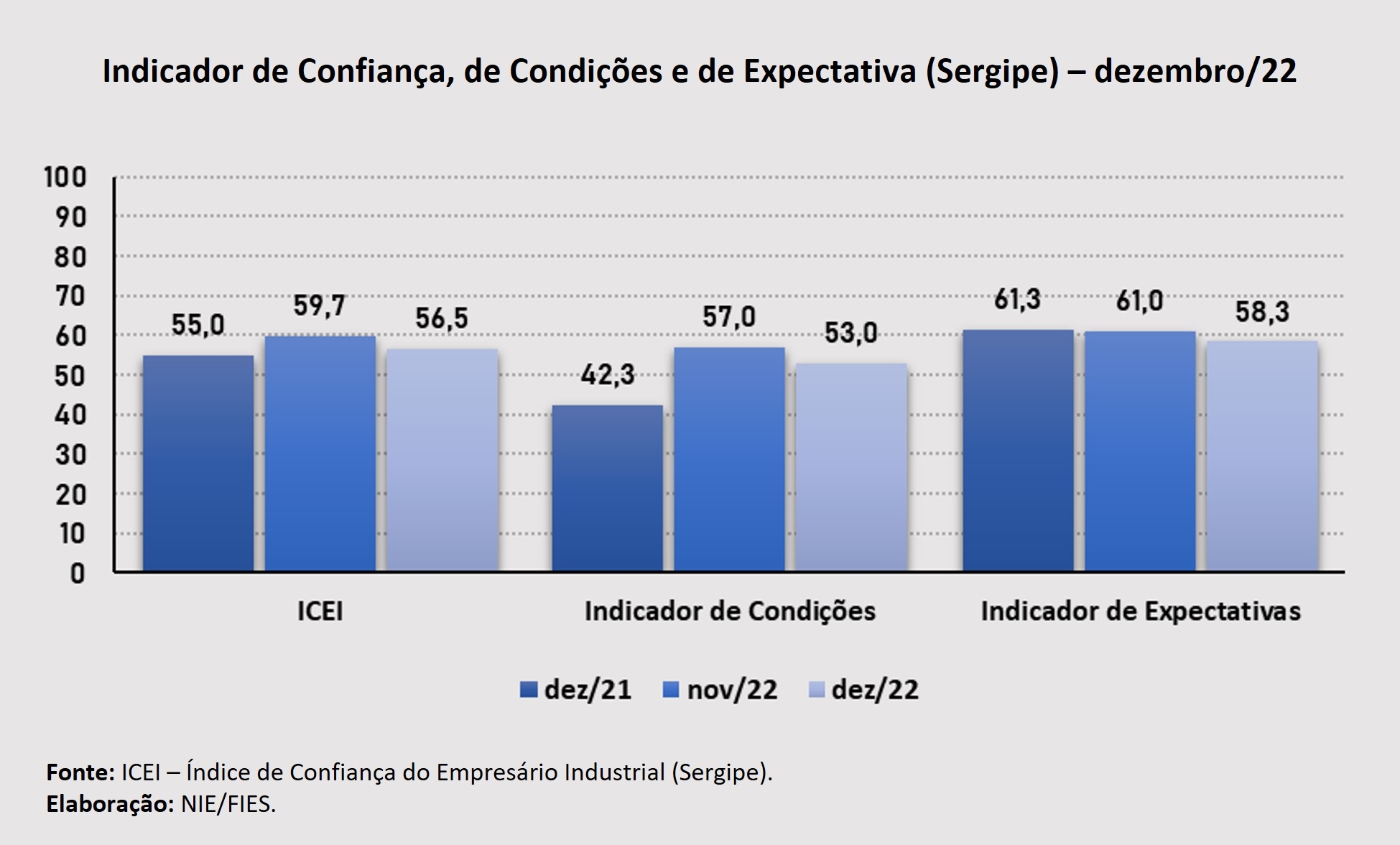 A Sondagem Industrial de Sergipe elaborada pelo Núcleo de Informações Econômicas (NIE), da Federação das Indústrias do Estado de Sergipe (FIES), revelou que a confiança do empresário industrial sergipano permaneceu acima da sua média histórica em dezembro de 2022. O ICEI - Índice de Confiança do Empresário Industrial, no último mês de 2022, alcançou 56,5 pontos, em Sergipe, após recuar 3,2 pontos, na comparação com novembro último.