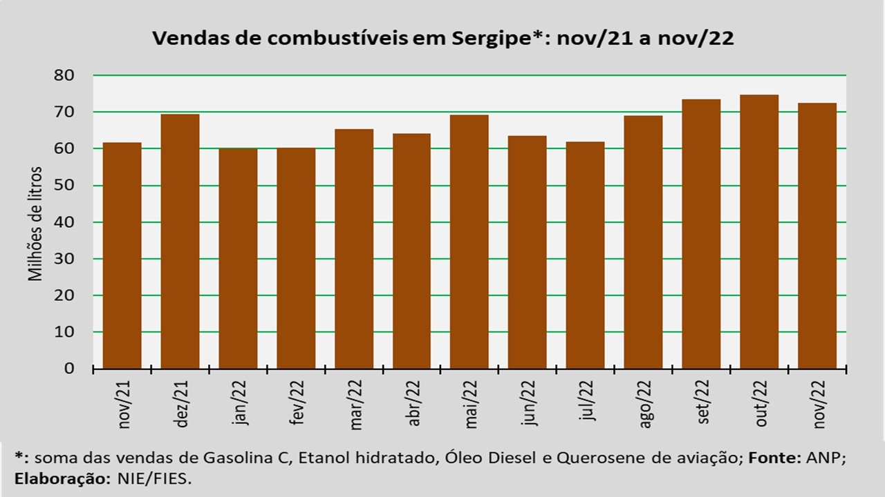 Análise realizada pelo Núcleo de Informações Econômicas da Federação das Indústrias do Estado de Sergipe (FIES), com base nos dados da Agência Nacional do Petróleo, Gás Natural e Biocombustíveis (ANP), indicou que as vendas totais de combustíveis em Sergipe, no mês de novembro, totalizaram aproximadamente 72,5 milhões de litros, assinalando crescimento de 17,4% quando comparado a novembro de 2021. Em relação ao mês imediatamente anterior (outubro/2022), as vendas reduziram 2,9%.