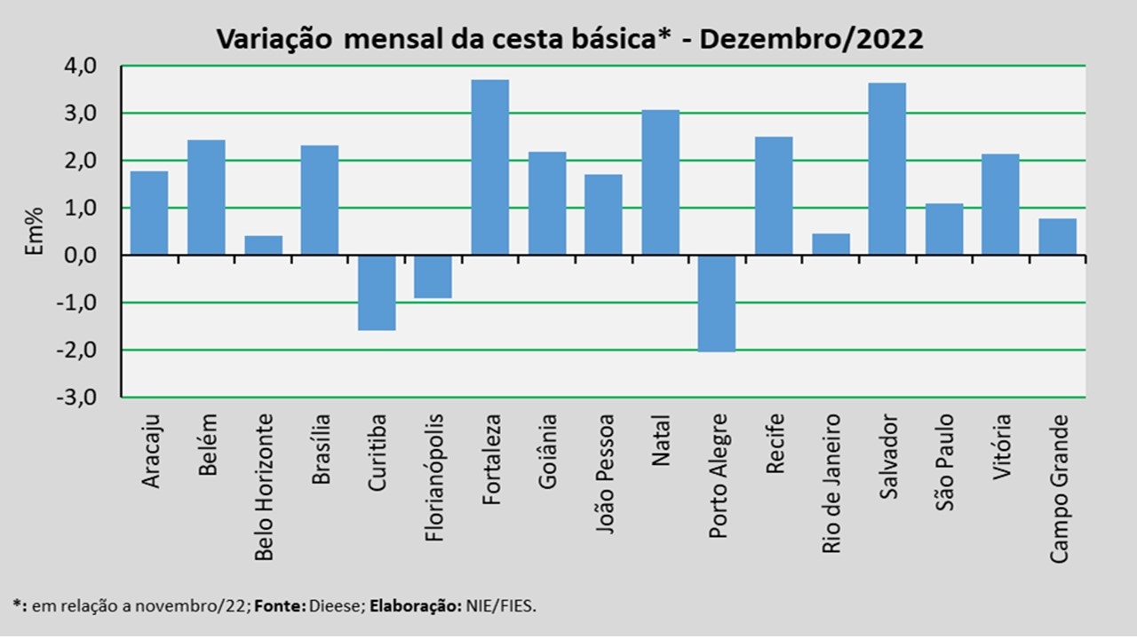 Na comparação com novembro de 2022, verificou-se aumento no valor da cesta em 14 das 17 capitais pesquisadas. Os aumentos mais expressivos na cesta de conjuntos essenciais ocorreram em Fortaleza (3,70%), Salvador (3,64%) e Natal (3,07%). Já as reduções mais intensas no custo da cesta no período foram registradas em Porto Alegre (- 2,03%), Curitiba (-1,58%) e Florianópolis (-0,90%).