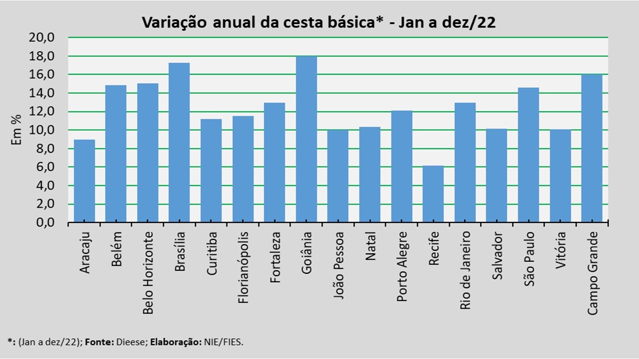 Todas as demais capitais apresentaram em 2022 custos mais elevados que em 2021, com destaque para Goiânia, que apresentou a maior variação, com aumento de 17,98%, seguida de Brasília (17,25%) e Campo Grande (16,03%). Por outro lado, as menores variações acumuladas em 2022 foram registradas em Recife (6,15%), Aracaju (8,99%) e João Pessoa (9,99%).