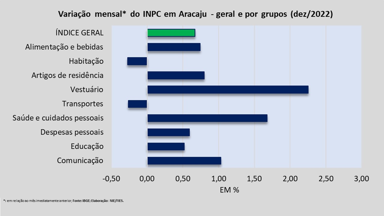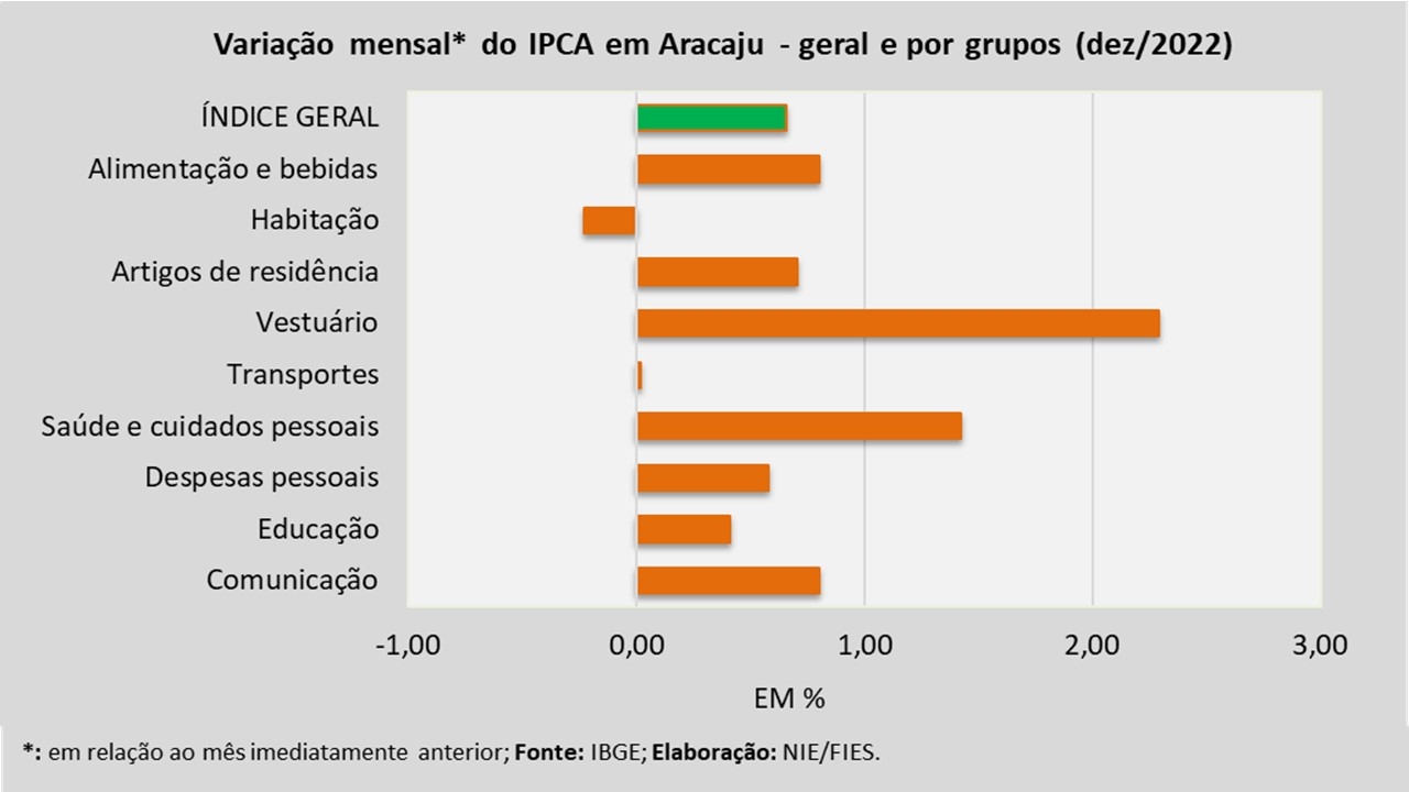 Análise realizada pelo Núcleo de Informações Econômicas da Federação das Indústrias do Estado de Sergipe (FIES), com base nos dados do Instituto Brasileiro de Geografia e Estatística (IBGE), revelou que, em dezembro de 2022, a capital sergipana teve inflação de 0,66%, medida pelo Índice de Preços ao Consumidor Amplo – IPCA.