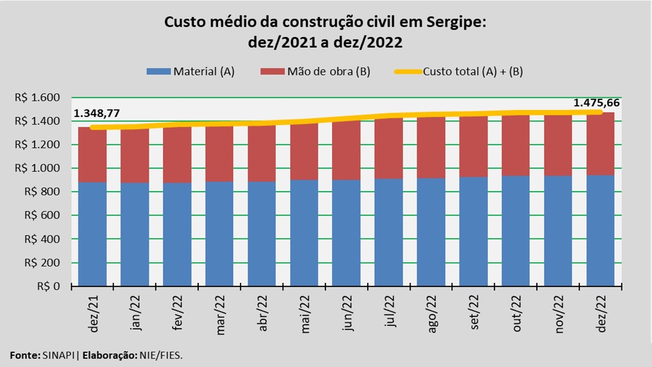 Análise realizada pelo Núcleo de Informações Econômicas da Federação das Indústrias do Estado de Sergipe (FIES), com base nos dados do Sistema Nacional de Pesquisa de Custos e Índices da Construção Civil – SINAPI, uma produção conjunta do IBGE e da Caixa Econômica Federal, revelou que o custo médio da construção em Sergipe, por metro quadrado (m²), em dezembro de 2022, registrou aumento de 0,2%, quando comparado com o mês imediatamente anterior, novembro último. No acumulado do ano que findou, o custo registrado apresentou aumento de 9,4%.