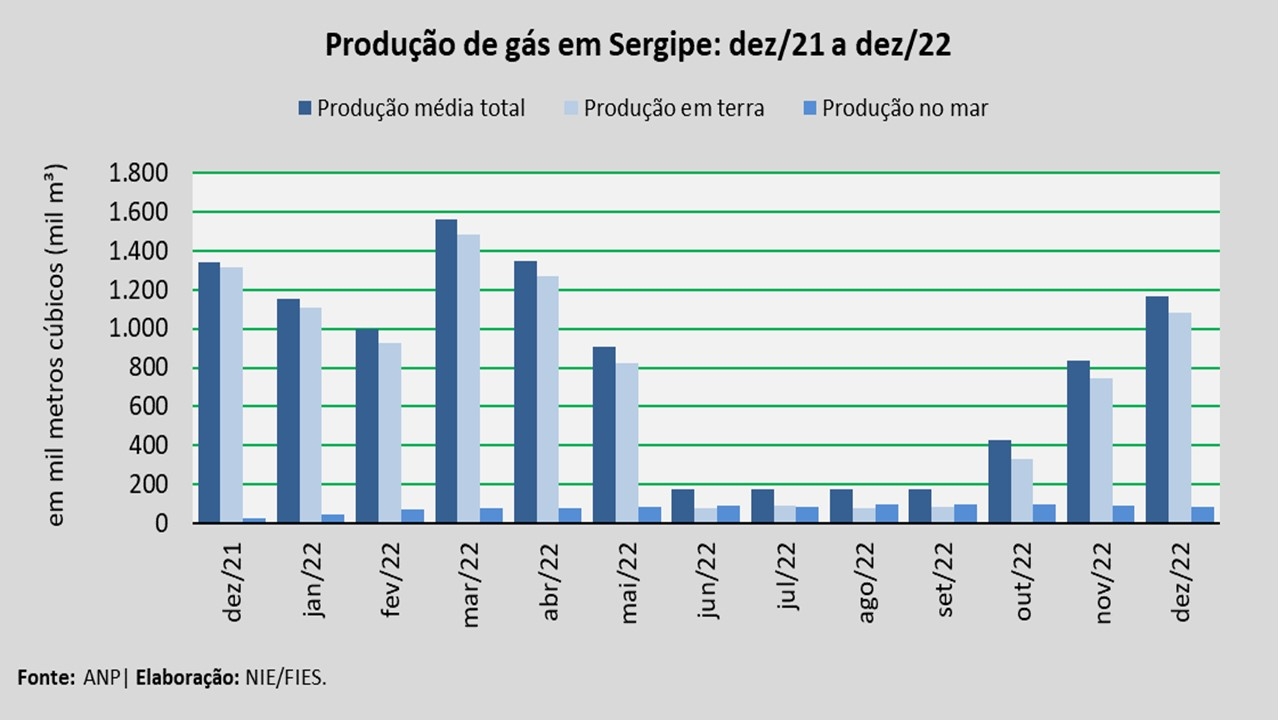A produção em terra foi a principal fonte de produção de gás natural no estado, totalizando cerca de 1,1 milhão de metros cúbicos (m³), no período analisado. Esse volume correspondeu a 92,5% do total produzido em dezembro de 2022 no estado, ao passo que a produção em mar foi de 87 mil metros cúbicos (m³), representando 7,5% da produção.