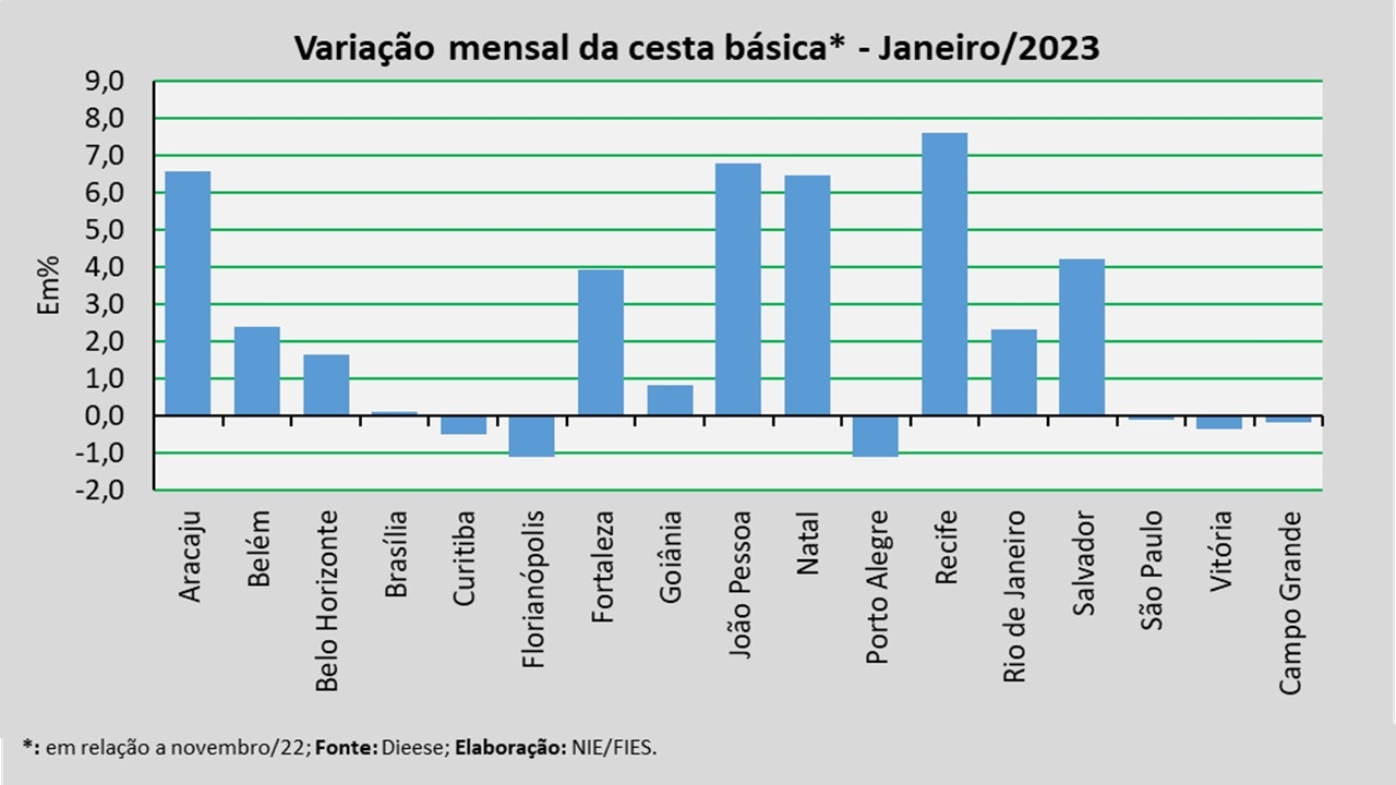 No mês analisado, levando-se em consideração a comparação com o mês anterior (dezembro/2022), observou-se redução no valor da cesta básica em seis das dezessete capitais pesquisadas, destacaram-se com as reduções mais expressivas: Florianópolis (-1,11%), Porto Alegre (-1,08%) e Curitiba (-0,50%). Já os maiores percentuais de altas foram registrados em Recife (+7,61%), João Pessoa (+6,80%) e Aracaju (+6,57%).![]()