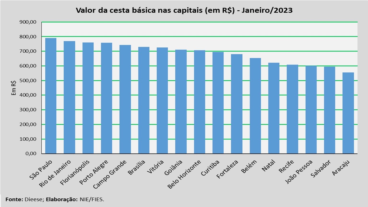 Em termos absolutos, a capital com a cesta mais cara, no mês analisado, foi São Paulo (R$ 790,57), seguida por Rio de Janeiro (R$ 770,19) e Florianópolis (R$ 760,65). Já as capitais com as cestas mais baratas foram Aracaju (R$ 555,28), seguida de Salvador (R$ 594,83) e João Pessoa (R$ 600,06).