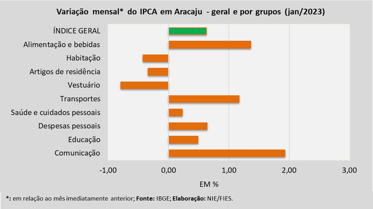 Análise realizada pelo Núcleo de Informações Econômicas da Federação das Indústrias do Estado de Sergipe (FIES), com base nos dados do Instituto Brasileiro de Geografia e Estatística (IBGE), revelou que, em janeiro deste ano, a capital sergipana teve inflação de 0,63%, medida pelo Índice de Preços ao Consumidor Amplo – IPCA.