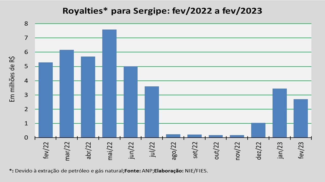 Análise realizada pelo Núcleo de Informações Econômicas da Federação das Indústrias do Estado de Sergipe (FIES), com base nos dados da Agência Nacional do Petróleo, Gás Natural e Biocombustíveis (ANP), revelou que o pagamento de royalties ao Estado de Sergipe, referentes à extração de petróleo e gás natural do mês de dezembro último, somou R$ 2,7 milhões. O valor, segundo a ANP, foi creditado em fevereiro.