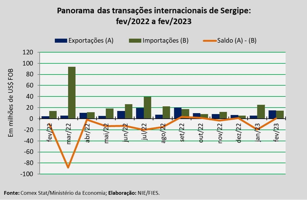 Análise realizada pelo Centro Internacional de Negócios – CIN/SE, da Federação das Indústrias do Estado de Sergipe (FIES), com base nos dados do Comex Stat, sistema para consultas e extração de dados do comércio exterior brasileiro, disponibilizado pelo Ministério da Economia, apontou que as exportações sergipanas, em fevereiro deste ano, somaram US$ 14,9 milhões.