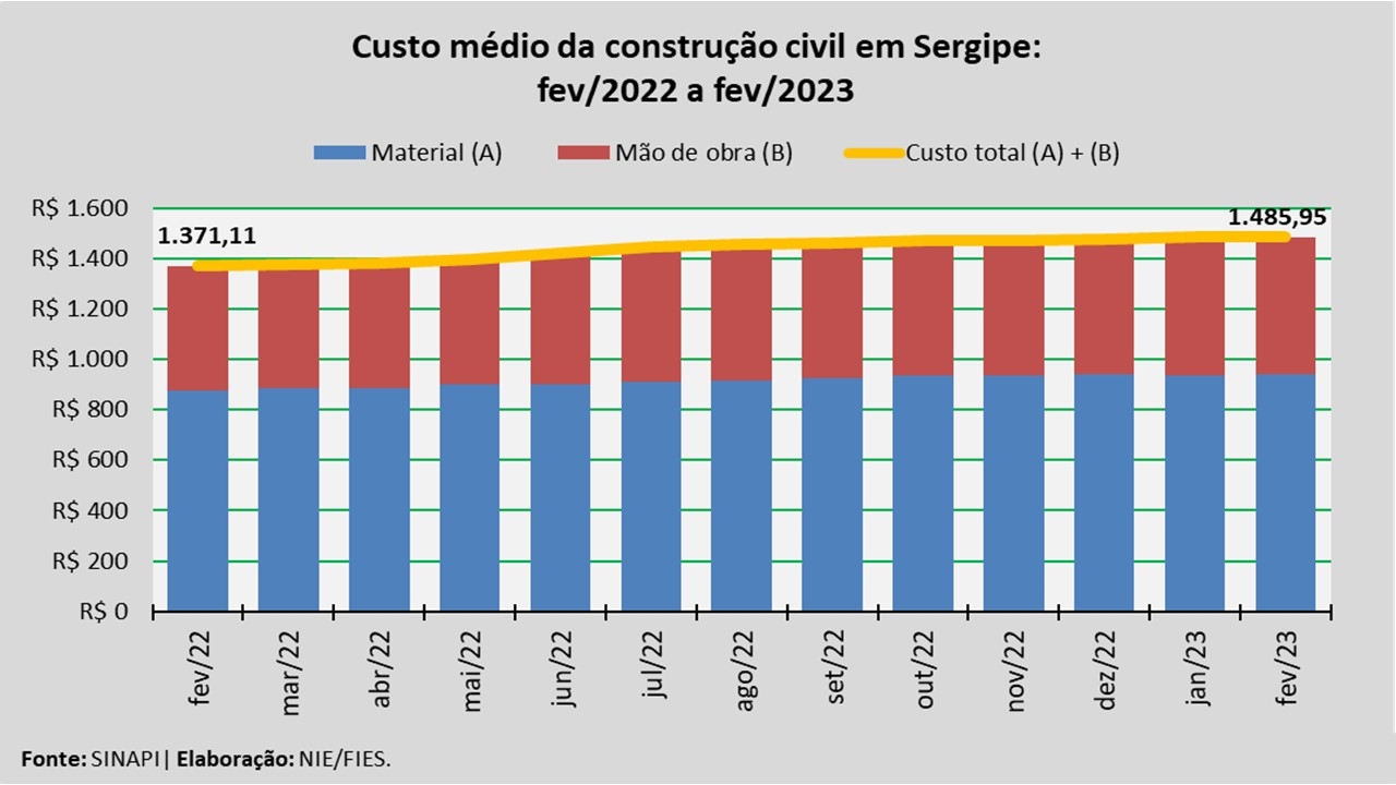 Em termos relativos, o custo com material, no mês considerado, teve aumento de 6,9% na comparação com o mesmo mês do ano que findou (fevereiro/2022). No entanto, quando comparado com janeiro de 2023, verificou-se um acréscimo de 0,2%.