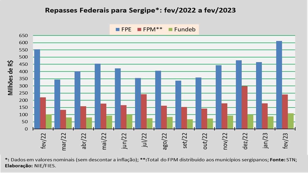 Análise realizada pelo Núcleo de Informações Econômicas da Federação das Indústrias do Estado de Sergipe (FIES), com base nos dados da Secretaria do Tesouro Nacional (STN), indicou que o repasse do Fundo de Participação dos Estados (FPE) para Sergipe, em fevereiro do ano corrente, foi de aproximadamente R$ 612,9 milhões.