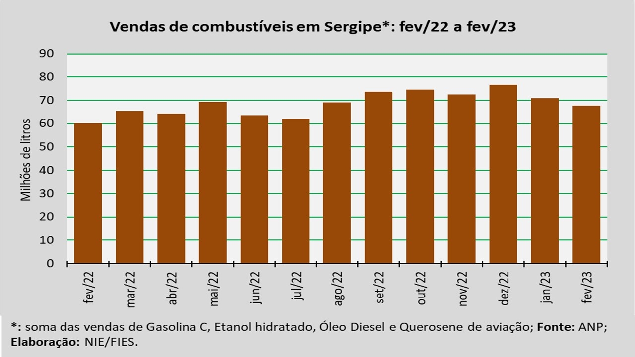 Análise realizada pelo Núcleo de Informações Econômicas da Federação das Indústrias do Estado de Sergipe (FIES), com base nos dados da Agência Nacional do Petróleo, Gás Natural e Biocombustíveis (ANP), indicou que as vendas totais de combustíveis em Sergipe, em fevereiro de 2023, totalizaram 67,7 milhões de litros, assinalando acréscimo de 12,5% quando comparado a fevereiro de 2022. Em relação ao mês imediatamente anterior (janeiro/2023), as vendas reduziram 4,5%.