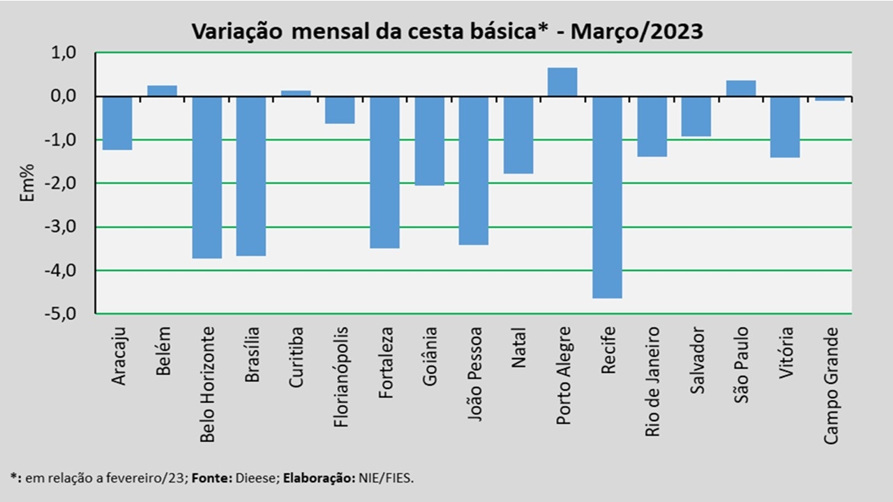 No mês analisado, levando-se em consideração a comparação com o mês anterior (fevereiro/2023), observou-se redução no valor da cesta básica em treze das dezessete capitais pesquisadas, destacaram-se com as reduções mais expressivas: Recife (-4,65%), Belo Horizonte (-3,72%) e Brasília (-3,67%). Já os maiores percentuais de altas foram registrados em Porto Alegre (+0,65%), São Paulo (+0,37%) e Belém (+0,24%).