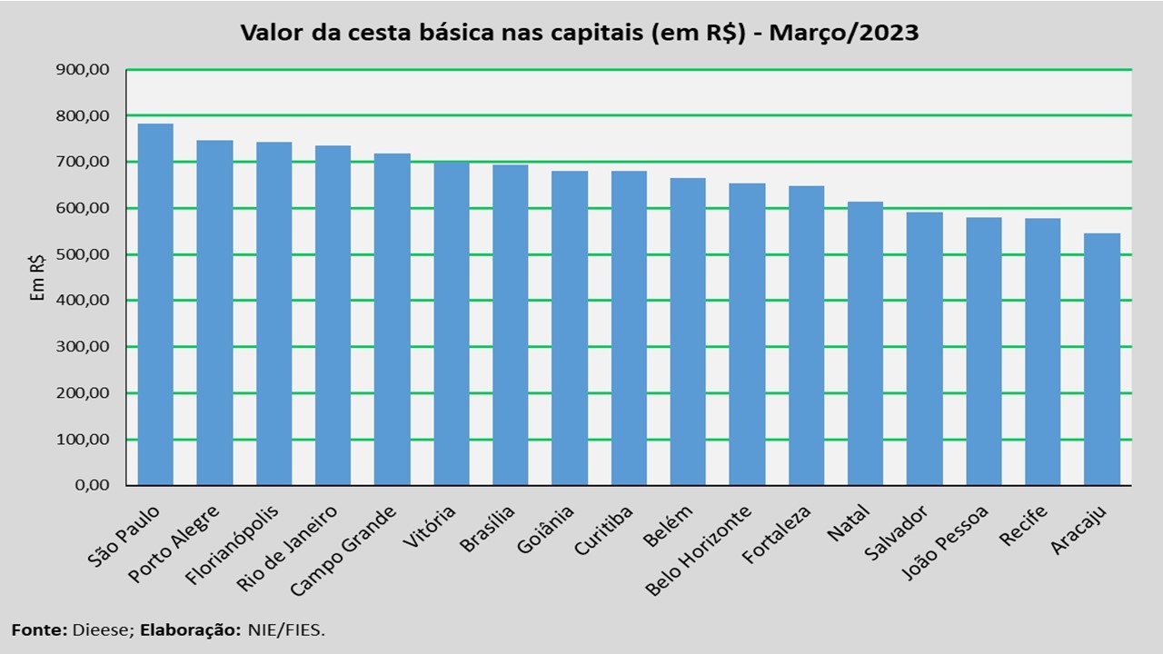 Em termos absolutos, a capital com a cesta mais cara, no mês analisado, foi São Paulo (R$ 782,23), seguida por Porto Alegre (R$ 746,12) e Florianópolis (R$ 742,23). Já as capitais com as cestas mais baratas foram Aracaju (R$ 546,14), seguida de Recife (R$ 578,73) e João Pessoa (R$ 579,57).