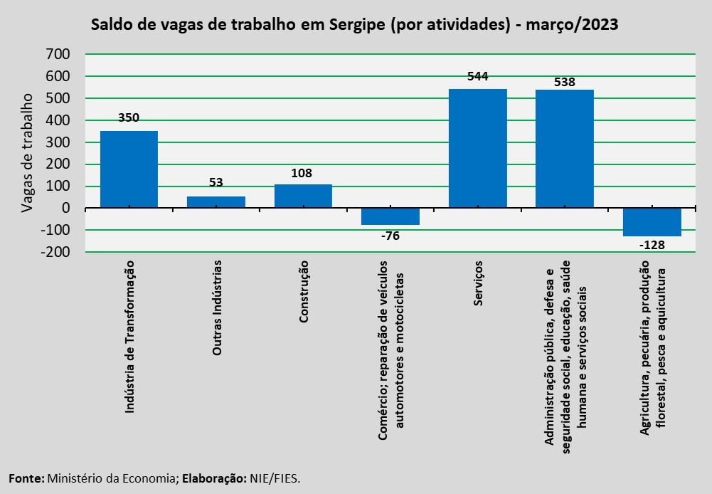 Dentre os municípios sergipanos, Aracaju registrou a maior criação de vagas de trabalho, no mês analisado, com 631 postos de trabalho criados, seguido de Nossa Senhora do Socorro (+179 vagas) e Estância (+155 vagas).