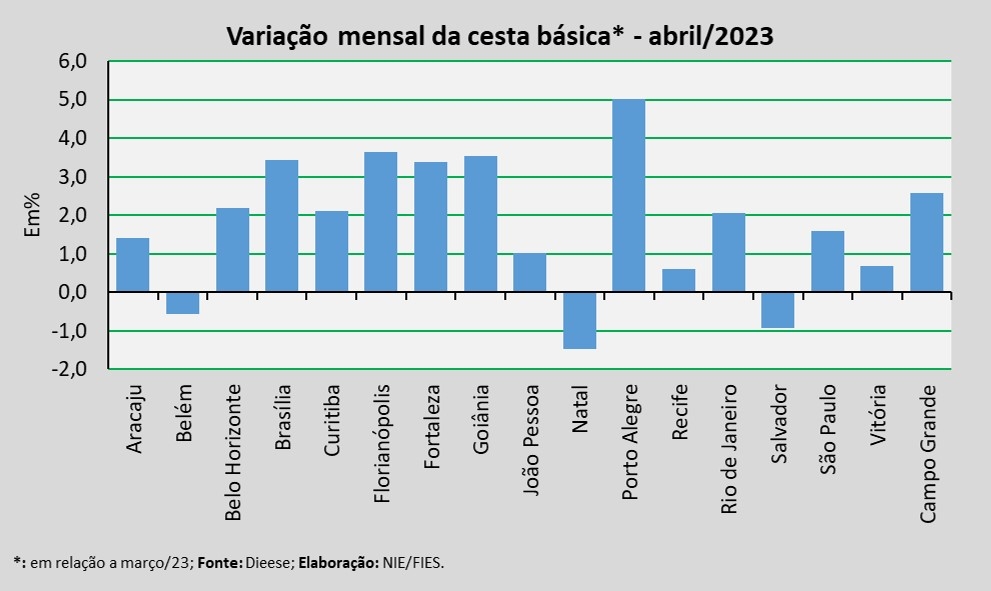 No mês analisado, levando-se em consideração a comparação com o mês anterior (março/2023), observou-se redução no valor da cesta básica em quatorze das dezessete capitais pesquisadas, as capitais que apresentaram reduções foram: Natal (-1,48%), Salvador (-0,91%) e Belém (-0,57%). Dentre as capitais que tiveram aumento as altas mais expressivas foram registradas em Porto Alegre (+5,02%), Florianópolis (+3,65%) e Goiânia (+3,53%).