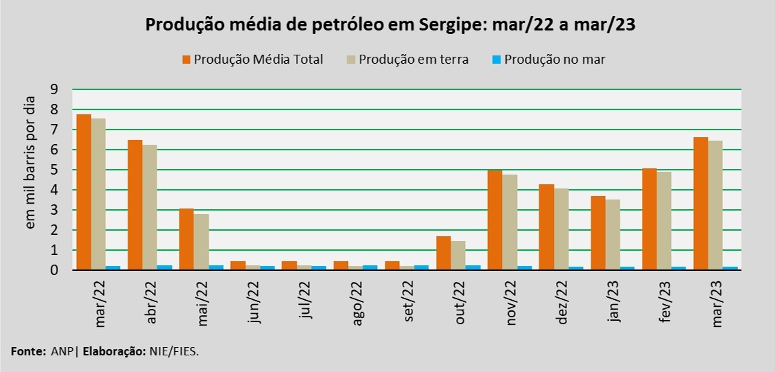 Análise realizada pelo Núcleo de Informações Econômicas da Federação das Indústrias do Estado de Sergipe (FIES), com base nos dados da Agência Nacional do Petróleo, Gás Natural e Biocombustíveis (ANP), revelou que a produção de petróleo no estado, no mês de março, alcançou, em média, cerca de 6,6 mil barris por dia (bpd), registrando um aumento de 30,8% em relação à produção média do mês anterior (fevereiro/2023). No comparativo com março de 2022, verificou-se decréscimo de 14,5%.