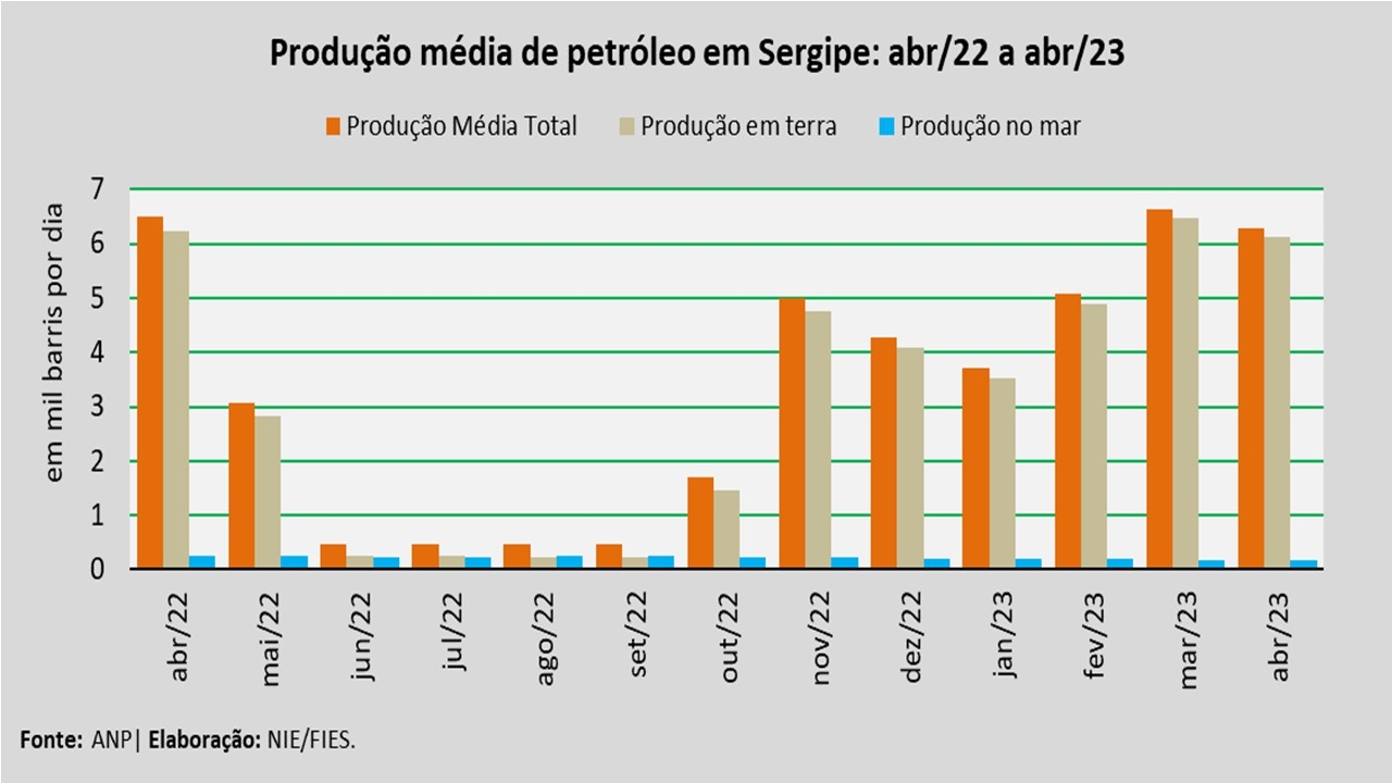 Análise realizada pelo Núcleo de Informações Econômicas da Federação das Indústrias do Estado de Sergipe (FIES), com base nos dados da Agência Nacional do Petróleo, Gás Natural e Biocombustíveis (ANP), revelou que a produção de petróleo no estado, no mês de abril, alcançou, em média, cerca de 6,3 mil barris por dia (bpd), registrando uma redução de 5,4% em relação à produção média do mês anterior (março/2023). No comparativo com abril de 2022, verificou-se decréscimo de 3,3%.