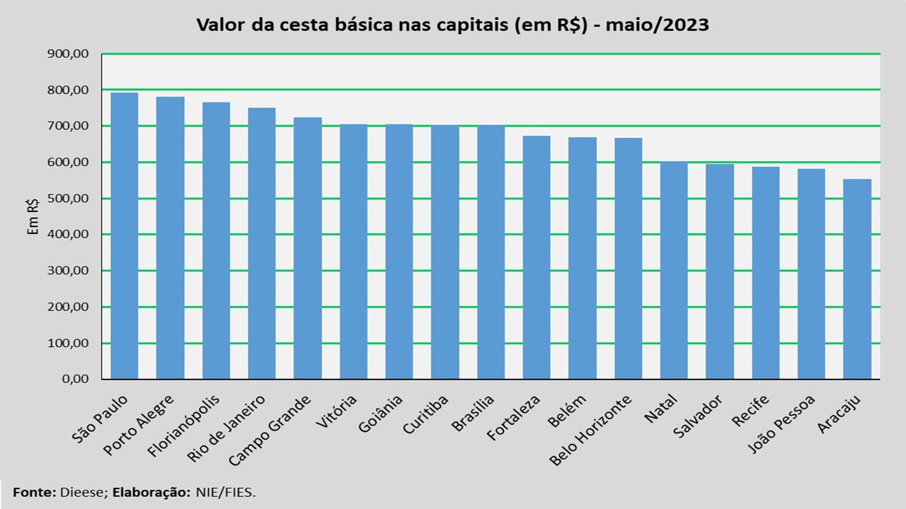 Em termos absolutos, a capital com a cesta mais cara, no mês analisado, foi São Paulo (R$ 791,82), seguida por Porto Alegre (R$ 781,56) e Florianópolis (R$ 765,13). Já as capitais com as cestas mais baratas foram Aracaju (R$ 553,76), seguida de João Pessoa (R$ 580,95) e Recife (R$ 587,13).